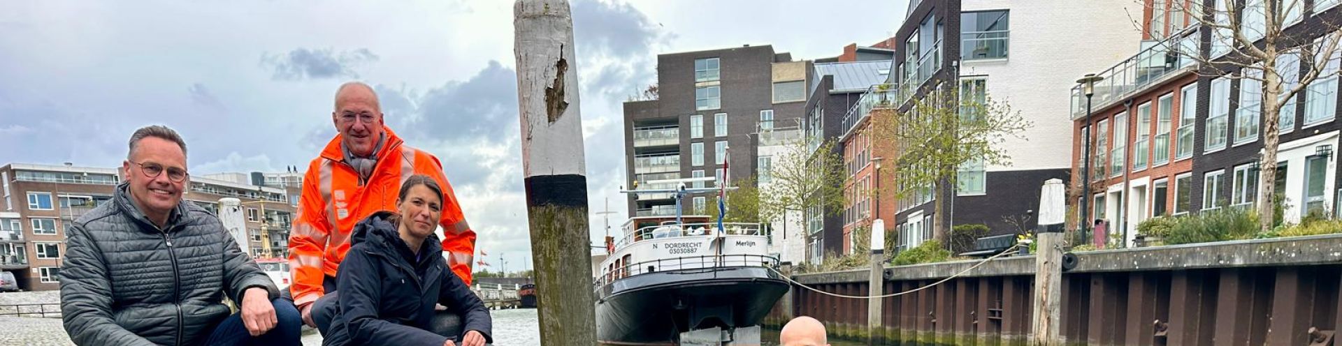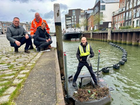 Foto vlnr: havenmeester Leen Paans, heemraad Watersysteem Piet van der Eijk van waterschap Hollandse Delta, wethouder Tanja de Jonge en op de plasticvanger Ramon Knoester van Clear Rivers.